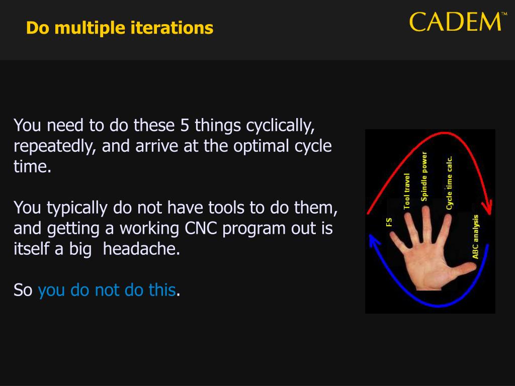 Do multiple iterations You need to do these 5 things cyclically, repeatedly, and arrive at the optimal cycle time. You typically do not have tools to do them, and getting a working CNC program out is itself a big headache. So you do not do this.