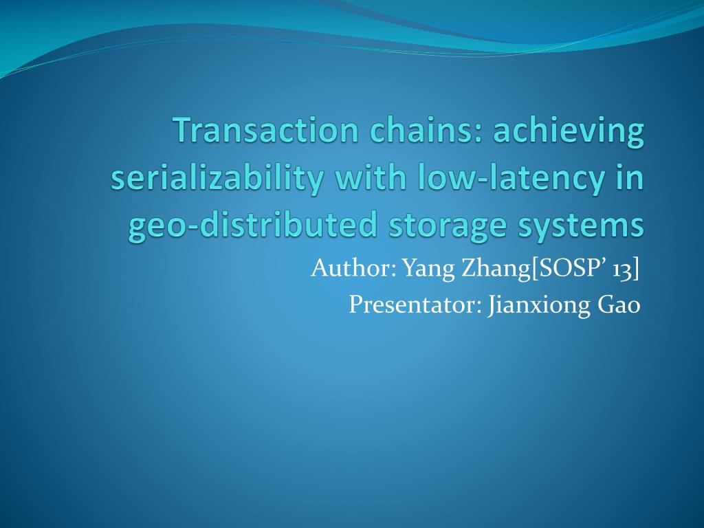 Transaction chains: achieving serializability with low-latency in geo-distributed storage systems Author: Yang Zhang[SOSP’ 13] Presentator: Jianxiong Gao