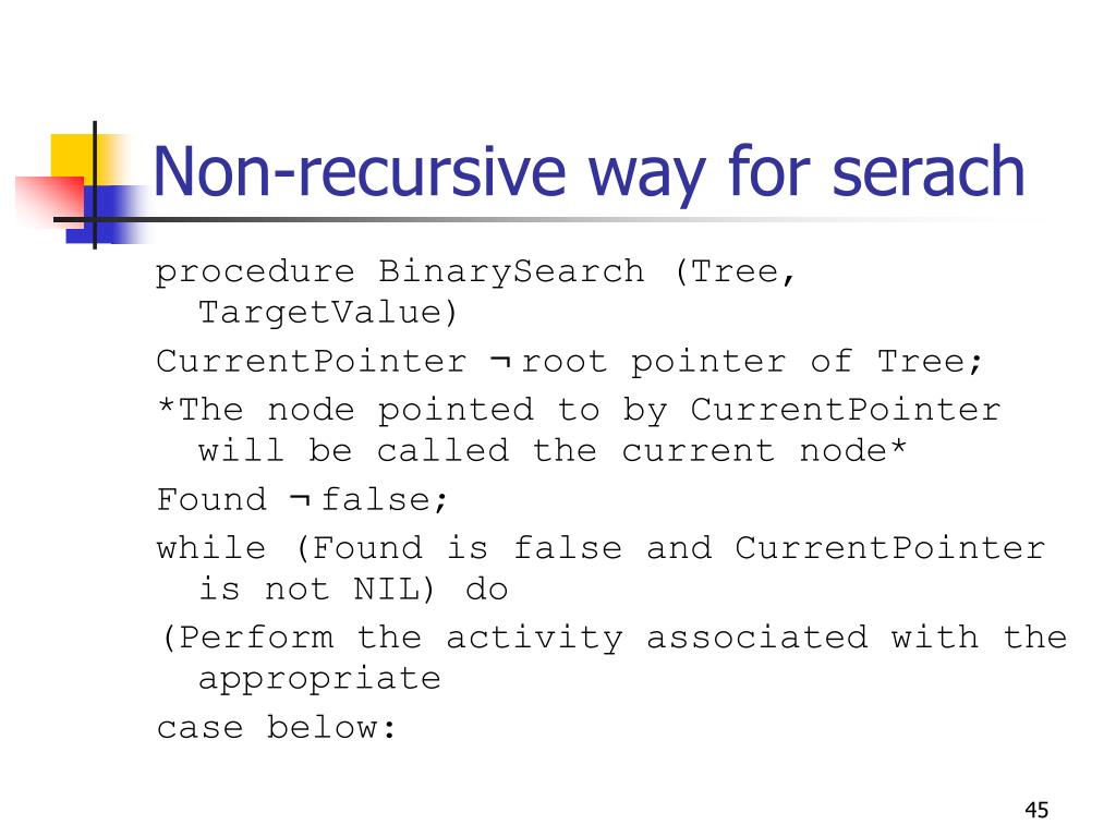 Non-recursive way for serach procedure BinarySearch (Tree, TargetValue) CurrentPointer ¬root pointer of Tree; *The node pointed to by CurrentPointer will be called the current node* Found ¬false; while (Found is false and CurrentPointer is not NIL) do (Perform the activity associated with the appropriate case below: