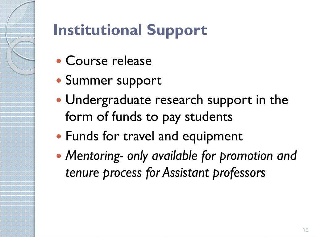 Institutional Support • Course release • Summer support • Undergraduate research support in the form of funds to pay students • Funds for travel and equipment • Mentoring- only available for promotion and tenure process for Assistant professors