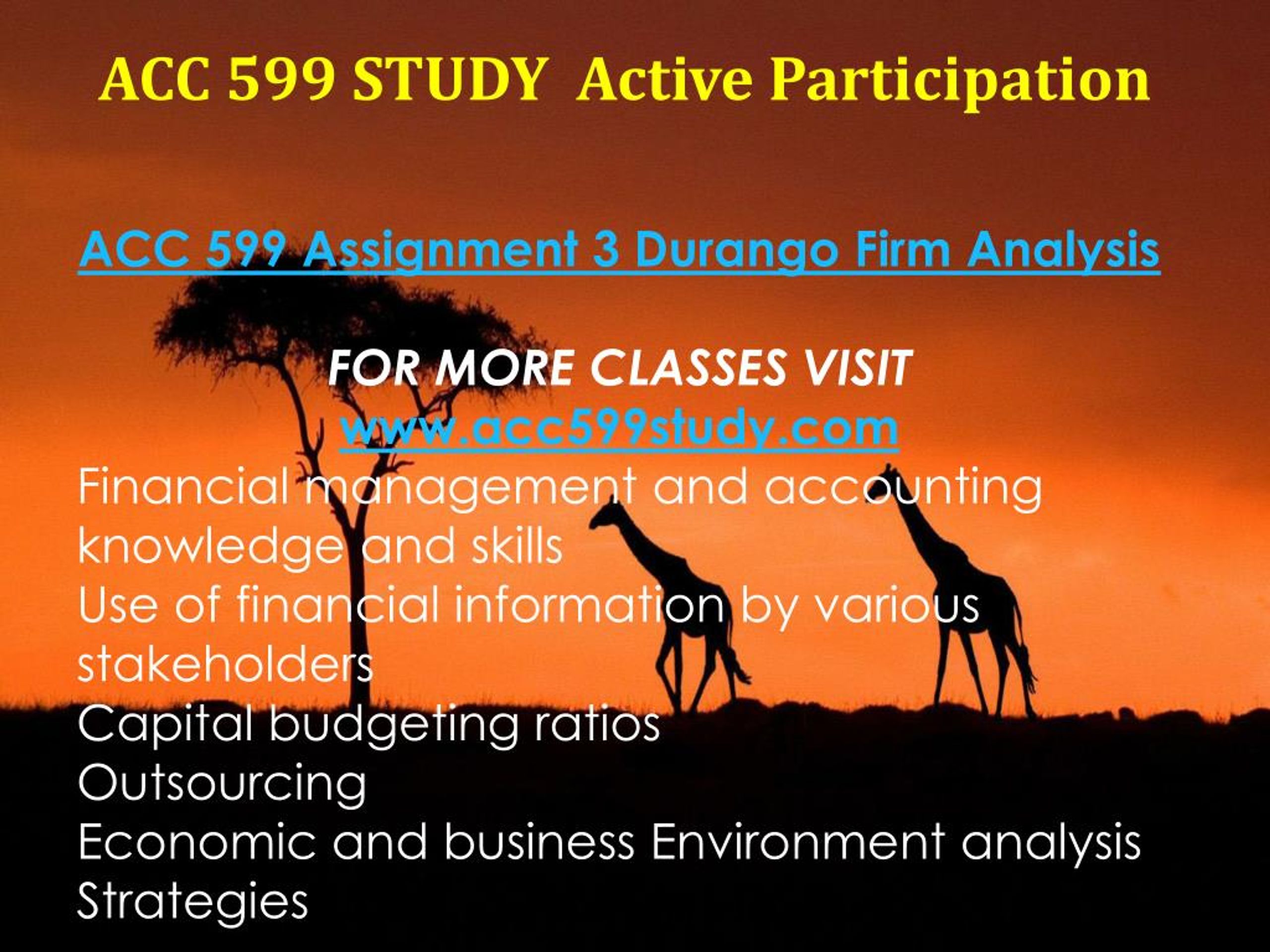 ACC 599 STUDY Active Participation ACC 599 Assignment 3 Durango Firm Analysis FOR MORE CLASSES VISIT www.acc599study.com Financial management and accounting knowledge and skills Use of financial information by various stakeholders Capital budgeting ratios Outsourcing Economic and business Environment analysis Strategies