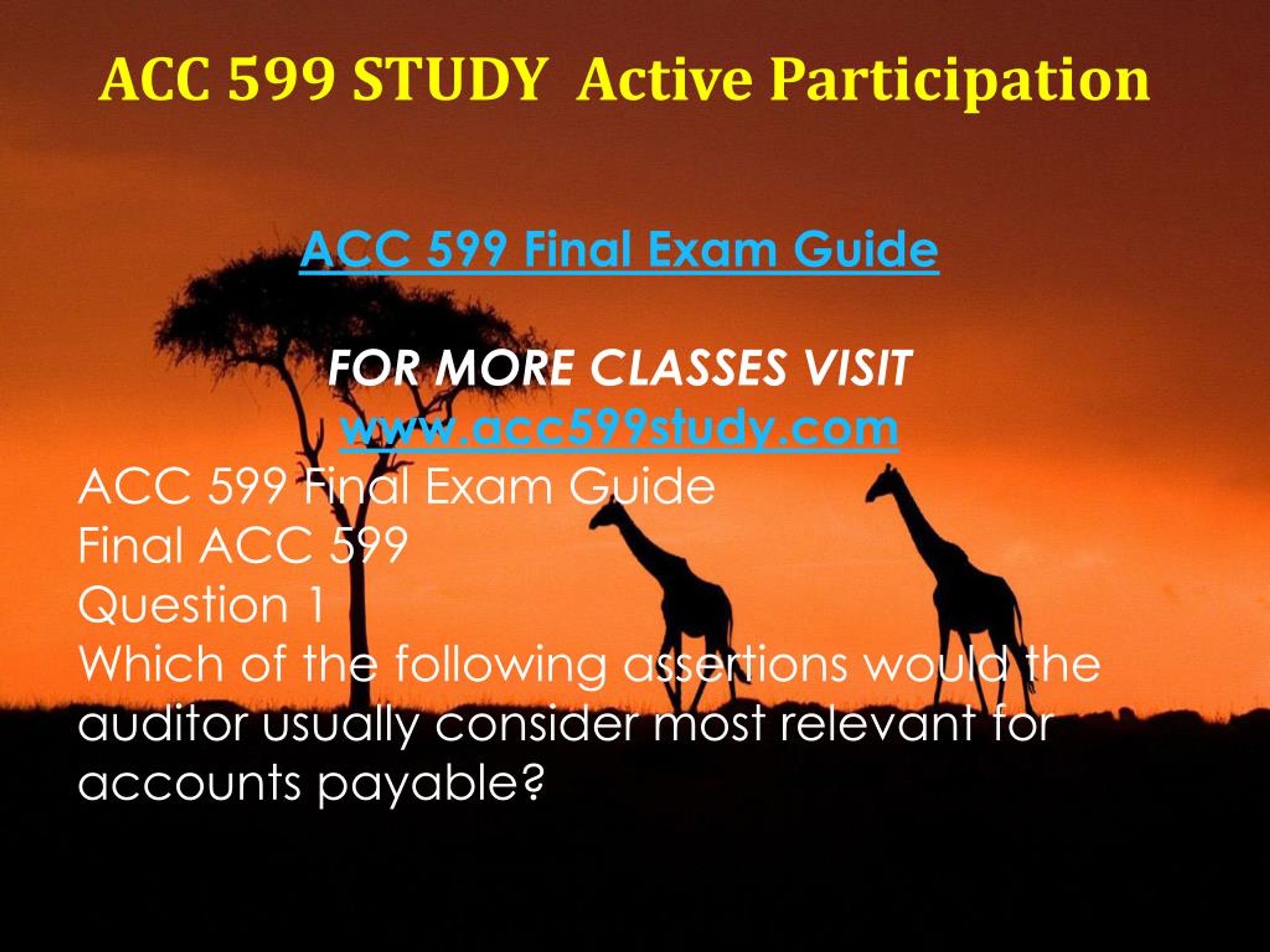 ACC 599 STUDY Active Participation ACC 599 Final Exam Guide FOR MORE CLASSES VISIT www.acc599study.com ACC 599 Final Exam Guide Final ACC 599 Question 1 Which of the following assertions would the auditor usually consider most relevant for accounts payable?