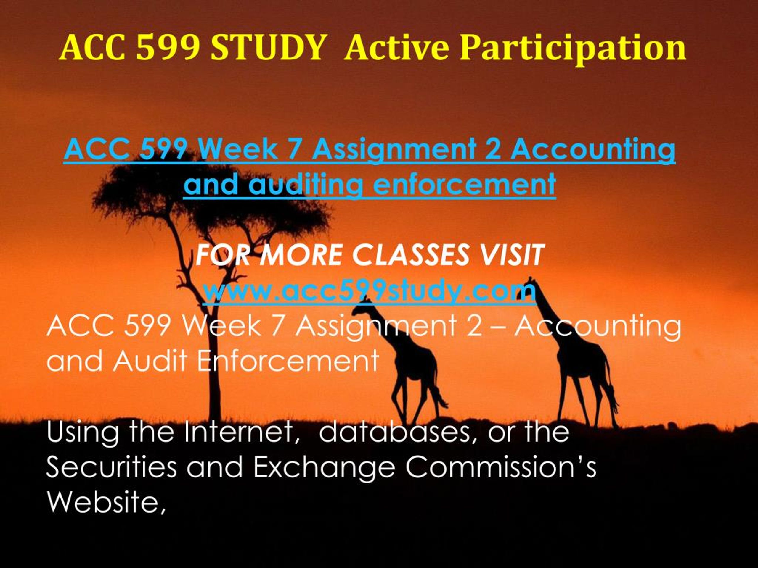 ACC 599 STUDY Active Participation ACC 599 Week 7 Assignment 2 Accounting and auditing enforcement FOR MORE CLASSES VISIT www.acc599study.com ACC 599 Week 7 Assignment 2 – Accounting and Audit Enforcement Using the Internet, databases, or the Securities and Exchange Commission’s Website,