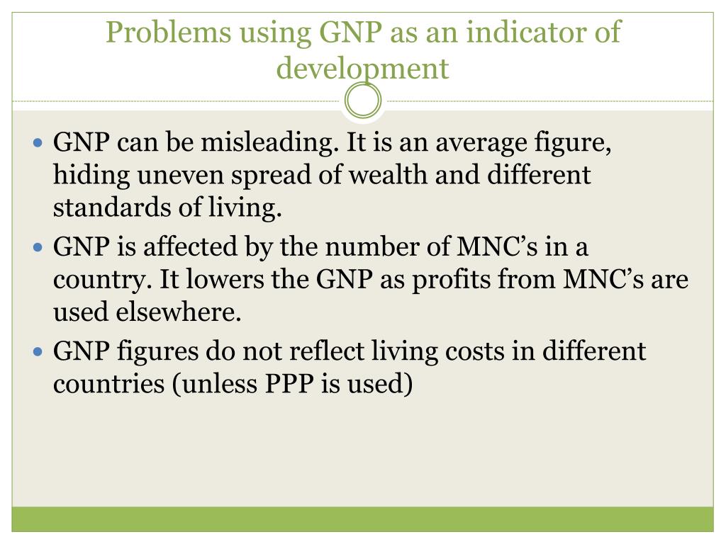 Problems using GNP as an indicator of development GNP can be misleading. It is an average figure, hiding uneven spread of wealth and different standards of living. GNP is affected by the number of MNC’s in a country. It lowers the GNP as profits from MNC’s are used elsewhere. GNP figures do not reflect living costs in different countries (unless PPP is used)