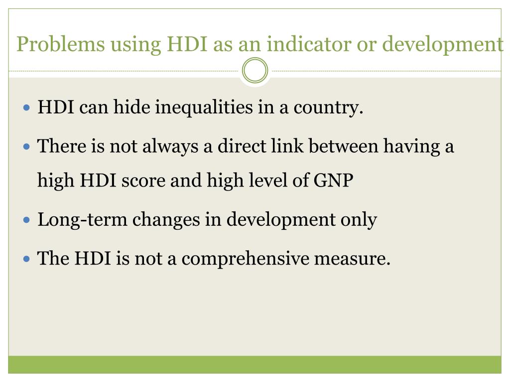 Problems using HDI as an indicator or development HDI can hide inequalities in a country. There is not always a direct link between having a high HDI score and high level of GNP Long-term changes in development only The HDI is not a comprehensive measure.