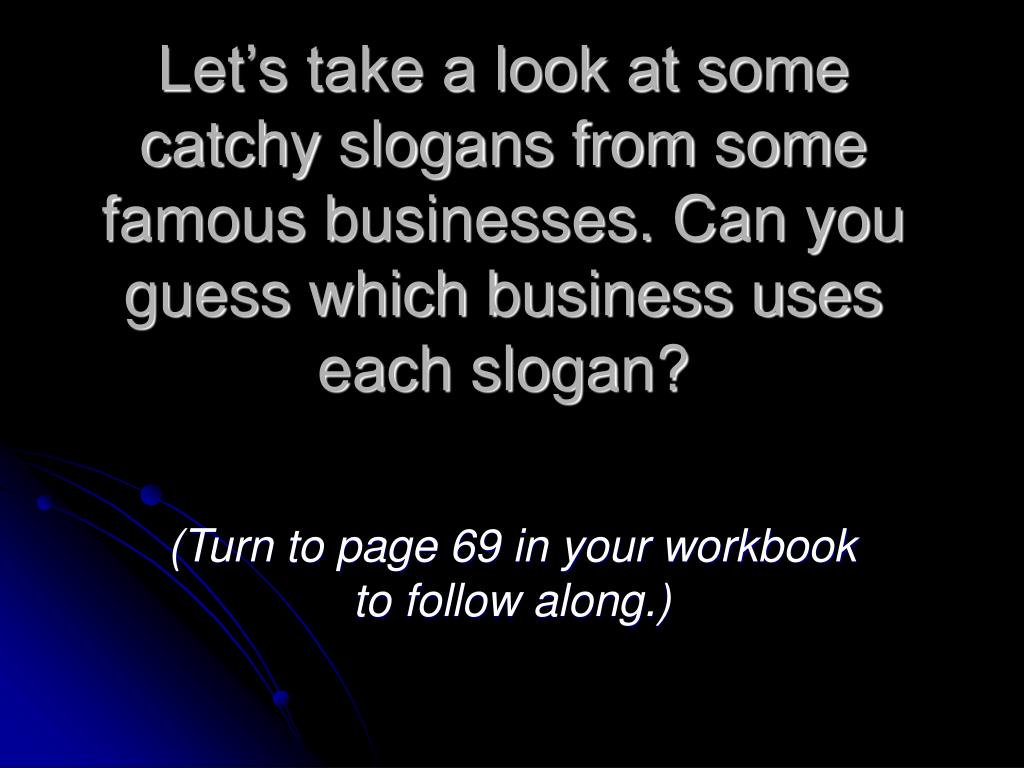Let’s take a look at some catchy slogans from some famous businesses. Can you guess which business uses each slogan? (Turn to page 69 in your workbook to follow along.)