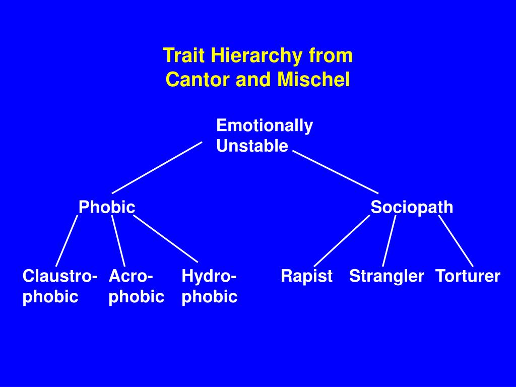 Phobic Sociopath Claustro-phobic Acro-phobic Hydro-phobic Rapist Strangler Torturer Trait Hierarchy fromCantor and Mischel Emotionally Unstable