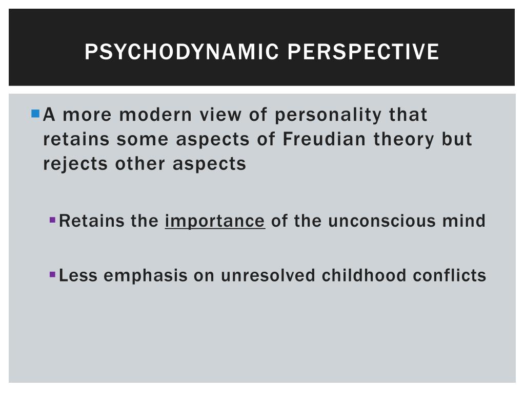 The psychodynamic perspective: NeoFreudians. AP Psychology. Psychodynamic Perspective. A more modern view of personality that retains some aspects of Freudian theory but rejects other aspects Retains the importance of the unconscious mind Less emphasis on unresolved childhood conflicts.
