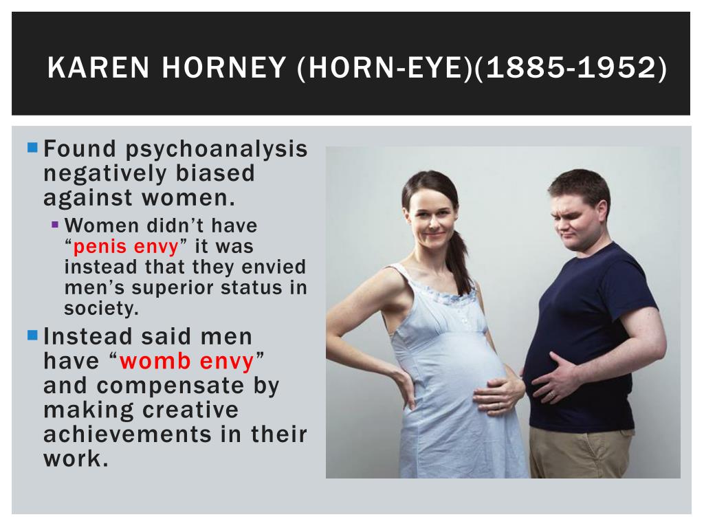 Karen Horney (HORN-eye)(1885-1952) • Found psychoanalysis negatively biased against women. • Women didn’t have “penis envy” it was instead that they envied men’s superior status in society. • Instead said men have “womb envy” and compensate by making creative achievements in their work.