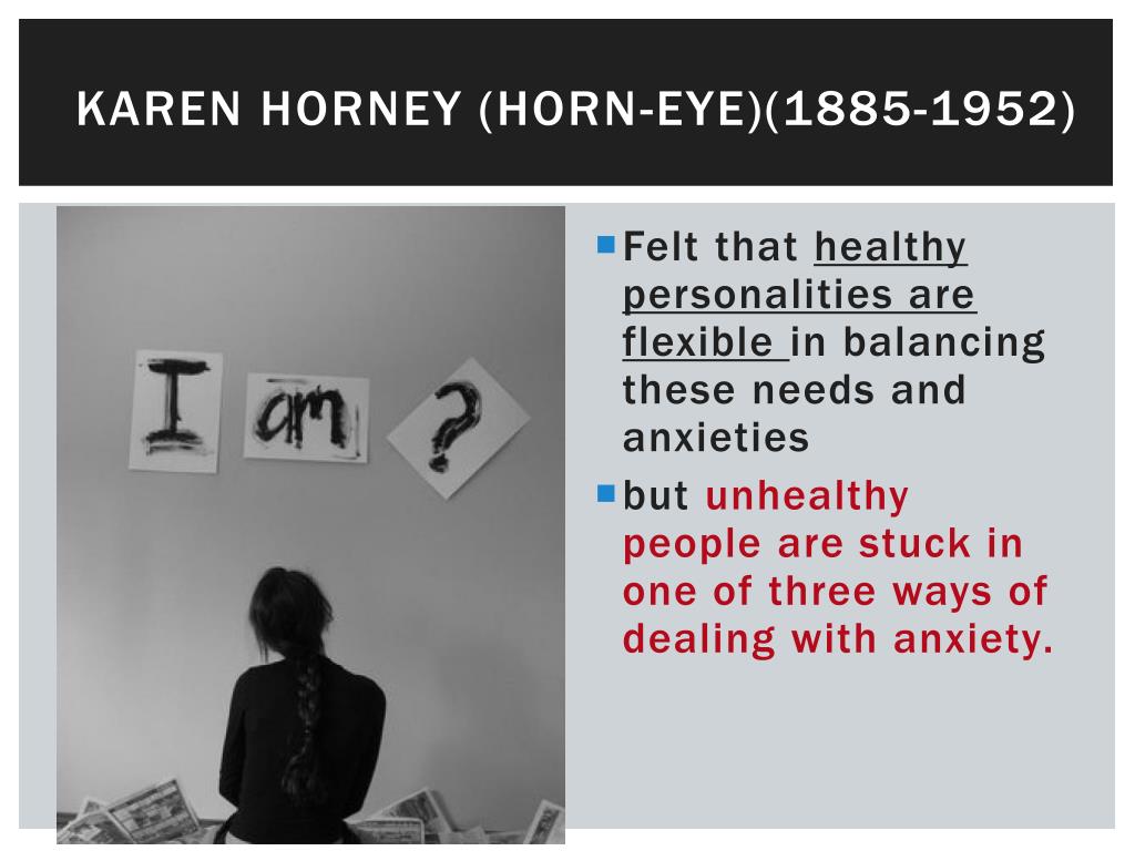 Karen Horney (HORN-eye)(1885-1952) • Felt that healthy personalities are flexible in balancing these needs and anxieties • but unhealthy people are stuck in one of three ways of dealing with anxiety.