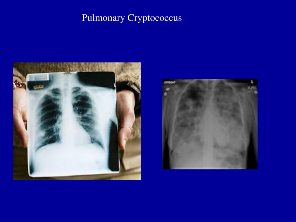 Diagnosis Serology • Latex agglutination, EIA, 90% sensitive & specific Radiology • CXR – infiltrates, nodules, lymphadenopathy, cavitation, effusion • CT/MRI – 50% normal, hydrocephalus, nodules