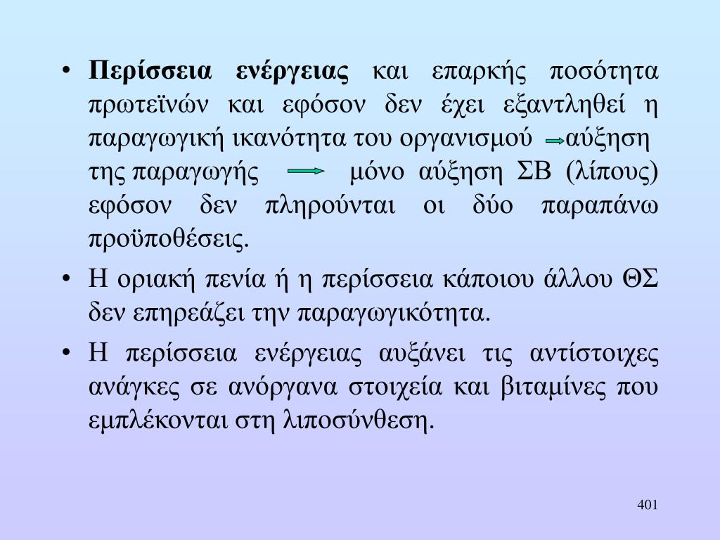 Περίσσεια ενέργειας και επαρκής ποσότητα πρωτεϊνών και εφόσον δεν έχει εξαντληθεί η παραγωγική ικανότητα του οργανισμού αύξηση της παραγωγής μόνο αύξηση ΣΒ (λίπους) εφόσον δεν πληρούνται οι δύο παραπάνω προϋποθέσεις. • Η οριακή πενία ή η περίσσεια κάποιου άλλου ΘΣ δεν επηρεάζει την παραγωγικότητα. • Η περίσσεια ενέργειας αυξάνει τις αντίστοιχες ανάγκες σε ανόργανα στοιχεία και βιταμίνες που εμπλέκονται στη λιποσύνθεση.