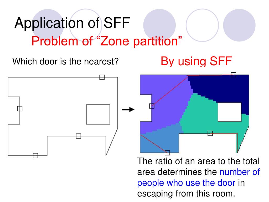 Problem of “Zone partition” Application of SFF By using SFF Which door is the nearest? The ratio of an area to the total area determines the number of people who use the door in escaping from this room.
