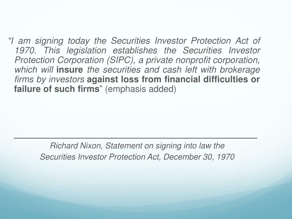 “I am signing today the Securities Investor Protection Act of 1970. This legislation establishes the Securities Investor Protection Corporation (SIPC), a private nonprofit corporation, which will insure the securities and cash left with brokerage firms by investors against loss from financial difficulties or failure of such firms” (emphasis added) _________________________________________________ Richard Nixon, Statement on signing into law the Securities Investor Protection Act, December 30, 1970