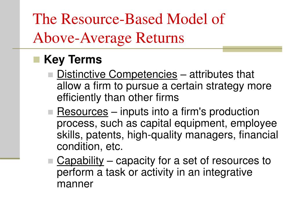 The Resource-Based Model of Above-Average Returns • Key Terms • Distinctive Competencies – attributes that allow a firm to pursue a certain strategy more efficiently than other firms • Resources – inputs into a firm's production process, such as capital equipment, employee skills, patents, high-quality managers, financial condition, etc. • Capability – capacity for a set of resources to perform a task or activity in an integrative manner