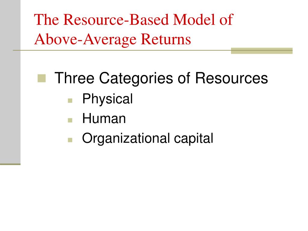 The Resource-Based Model of Above-Average Returns • Three Categories of Resources • Physical • Human • Organizational capital