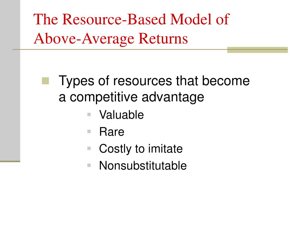 The Resource-Based Model of Above-Average Returns • Types of resources that become a competitive advantage • Valuable • Rare • Costly to imitate • Nonsubstitutable