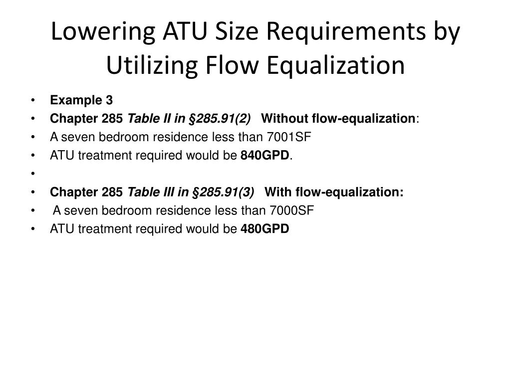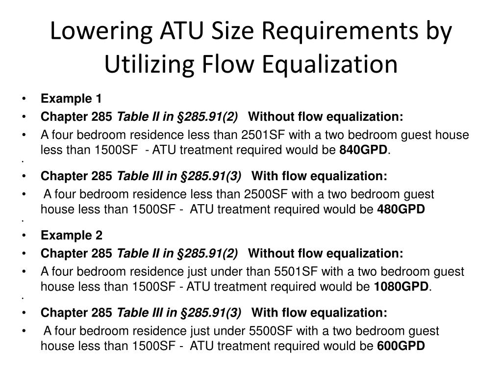 Lowering ATU Size Requirements by Utilizing Flow Equalization • Example 1 • Chapter 285 Table II in §285.91(2) Without flow equalization: • A four bedroom residence less than 2501SF with a two bedroom guest house less than 1500SF - ATU treatment required would be 840GPD. • Chapter 285 Table III in §285.91(3) With flow equalization: • A four bedroom residence less than 2500SF with a two bedroom guest house less than 1500SF - ATU treatment required would be 480GPD • Example 2 • Chapter 285 Table II in §285.91(2) Without flow equalization: • A four bedroom residence just under than 5501SF with a two bedroom guest house less than 1500SF - ATU treatment required would be 1080GPD. • Chapter 285 Table III in §285.91(3) With flow equalization: • A four bedroom residence just under 5500SF with a two bedroom guest house less than 1500SF - ATU treatment required would be 600GPD