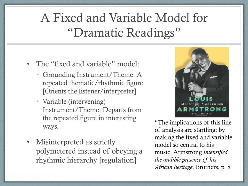 A Fixed and Variable Model for “Dramatic Readings” • The “fixed and variable” model: • Grounding Instrument/Theme: A repeated thematic/rhythmic figure [Orients the listener/interpreter] • Variable (intervening) Instrument/Theme: Departs from the repeated figure in interesting ways. • Misinterpreted as strictly polymetered instead of obeying a rhythmic hierarchy [regulation] “The implications of this line of analysis are startling: by making the fixed and variable model so central to his music, Armstrong intensified the audible presence of his African heritage. Brothers, p. 8
