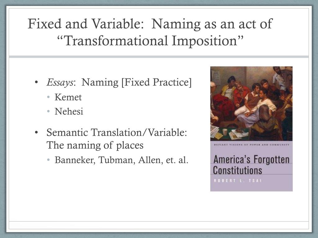 Fixed and Variable: Naming as an act of “Transformational Imposition” • Essays: Naming [Fixed Practice] • Kemet • Nehesi • Semantic Translation/Variable: The naming of places • Banneker, Tubman, Allen, et. al.