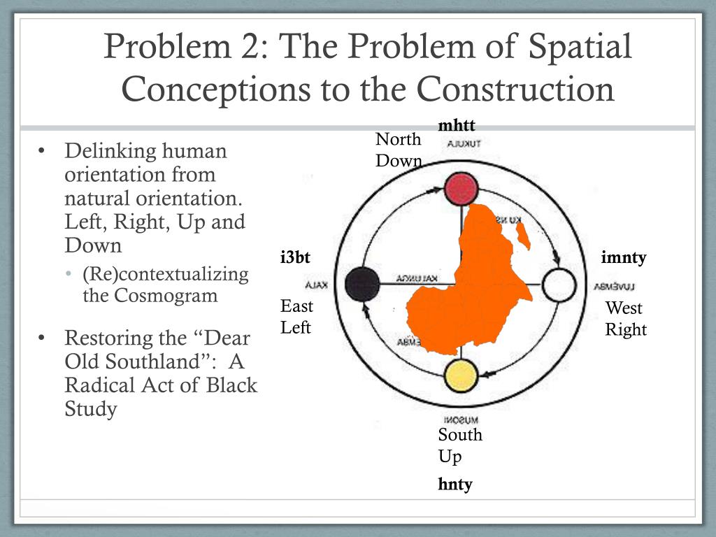 Problem 2: The Problem of Spatial Conceptions to the Construction mhtt North Down • Delinking human orientation from natural orientation. Left, Right, Up and Down • (Re)contextualizing the Cosmogram • Restoring the “Dear Old Southland”: A Radical Act of Black Study i3bt imnty East Left West Right South Up hnty