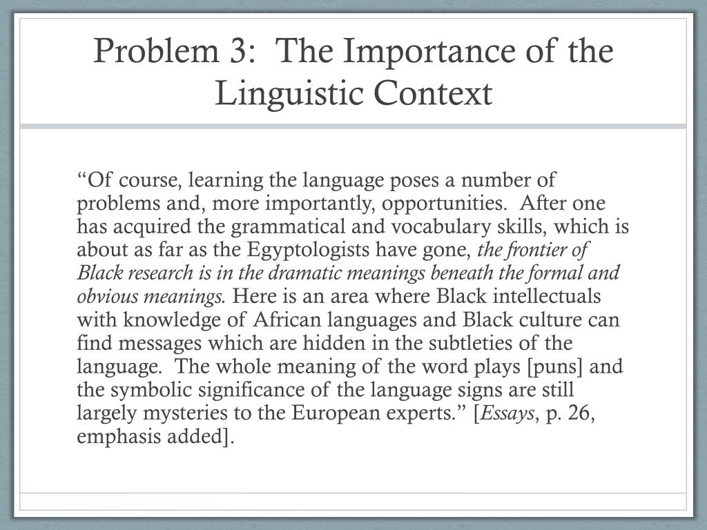 Problem 3: The Importance of the Linguistic Context “Of course, learning the language poses a number of problems and, more importantly, opportunities. After one has acquired the grammatical and vocabulary skills, which is about as far as the Egyptologists have gone, the frontier of Black research is in the dramatic meanings beneath the formal and obvious meanings. Here is an area where Black intellectuals with knowledge of African languages and Black culture can find messages which are hidden in the subtleties of the language. The whole meaning of the word plays [puns] and the symbolic significance of the language signs are still largely mysteries to the European experts.” [Essays, p. 26, emphasis added].