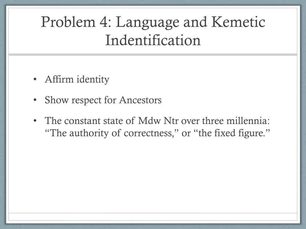 Problem 4: Language and KemeticIndentification • Affirm identity • Show respect for Ancestors • The constant state of MdwNtr over three millennia: “The authority of correctness,” or “the fixed figure.”