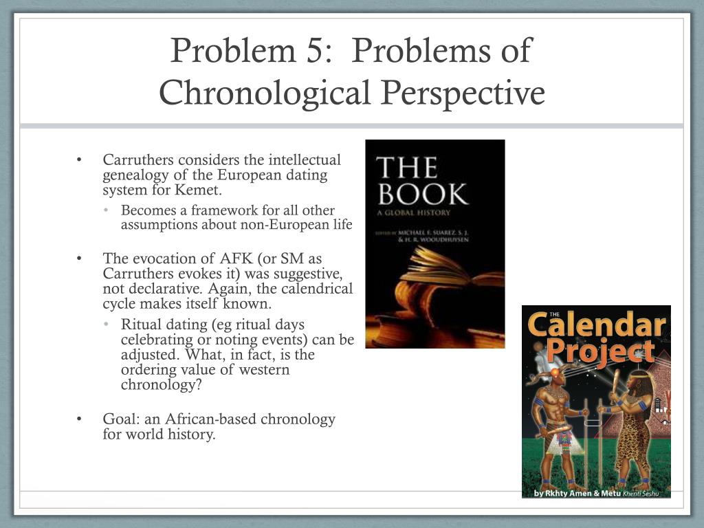 Problem 5: Problems of Chronological Perspective • Carruthersconsiders the intellectual genealogy of the European dating system for Kemet. • Becomes a framework for all other assumptions about non-European life • The evocation of AFK (or SM as Carruthers evokes it) was suggestive, not declarative. Again, the calendrical cycle makes itself known. • Ritual dating (eg ritual days celebrating or noting events) can be adjusted. What, in fact, is the ordering value of western chronology? • Goal: an African-based chronology for world history.