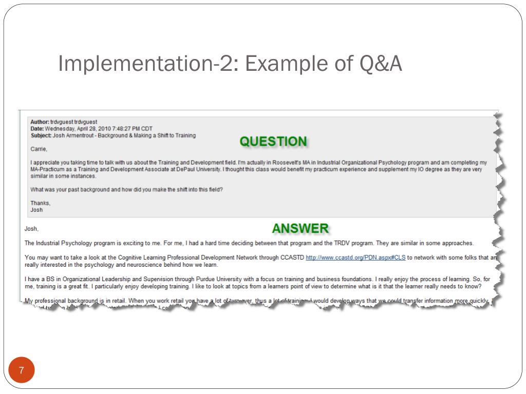 Overview The challenge The solution Provide a guest speaker for students in a fully online, asynchronous course. Make it easy for both students and the guest speaker: No separate software. Keep the promise of ‘time and location flexible’ for online courses at RU: Respect students’ schedules, allowing Q&A over a period of a week (a module). Don’t overwhelm the guest speaker. Choose a guest speaker who had graduated from the MATD program. Example of success. Example of ‘giving back’ to the program. Familiar with Blackboard. Example of continuing our outreach to our graduates. Has one week to answer questions and ‘interact’ with students.