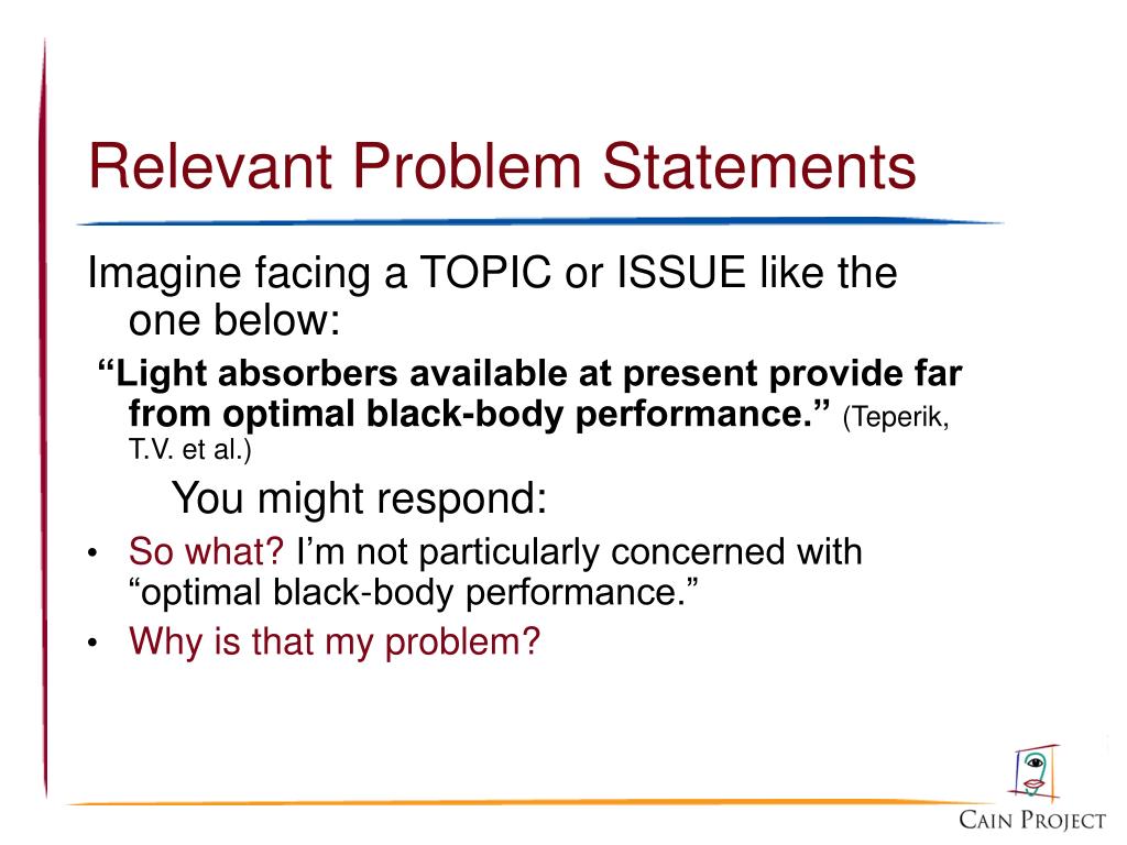 Relevant Problem Statements Imagine facing a TOPIC or ISSUE like the one below: “Light absorbers available at present provide far from optimal black-body performance.”(Teperik, T.V. et al.) You might respond: • So what? I’m not particularly concerned with “optimal black-body performance.” • Why is that my problem?