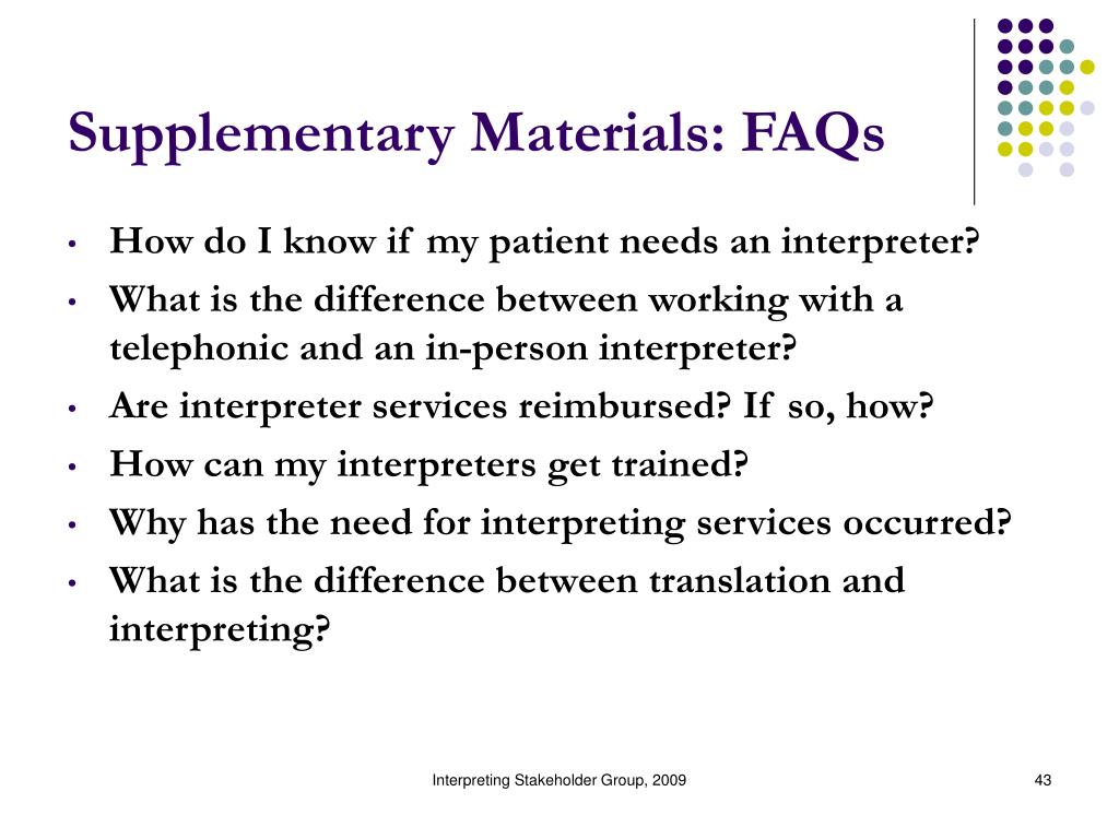 Supplementary Materials: FAQs • How do I know if my patient needs an interpreter? • What is the difference between working with a telephonic and an in-person interpreter? • Are interpreter services reimbursed? If so, how? • How can my interpreters get trained? • Why has the need for interpreting services occurred? • What is the difference between translation and interpreting? Interpreting Stakeholder Group, 2009