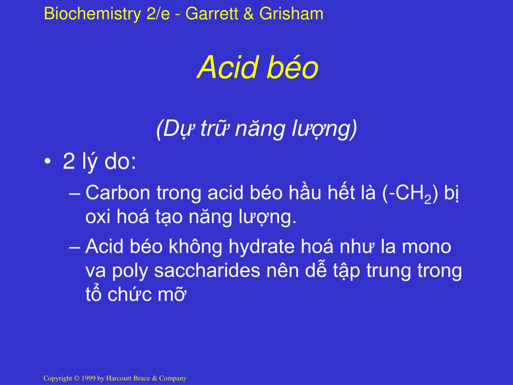 Acid béo (Dự trữ năng lượng) • 2 lý do: • Carbon trong acid béo hầu hết là (-CH2) bị oxi hoá tạo năng lượng. • Acid béo không hydrate hoá như la mono va poly saccharides nên dễ tập trung trong tổ chức mỡ