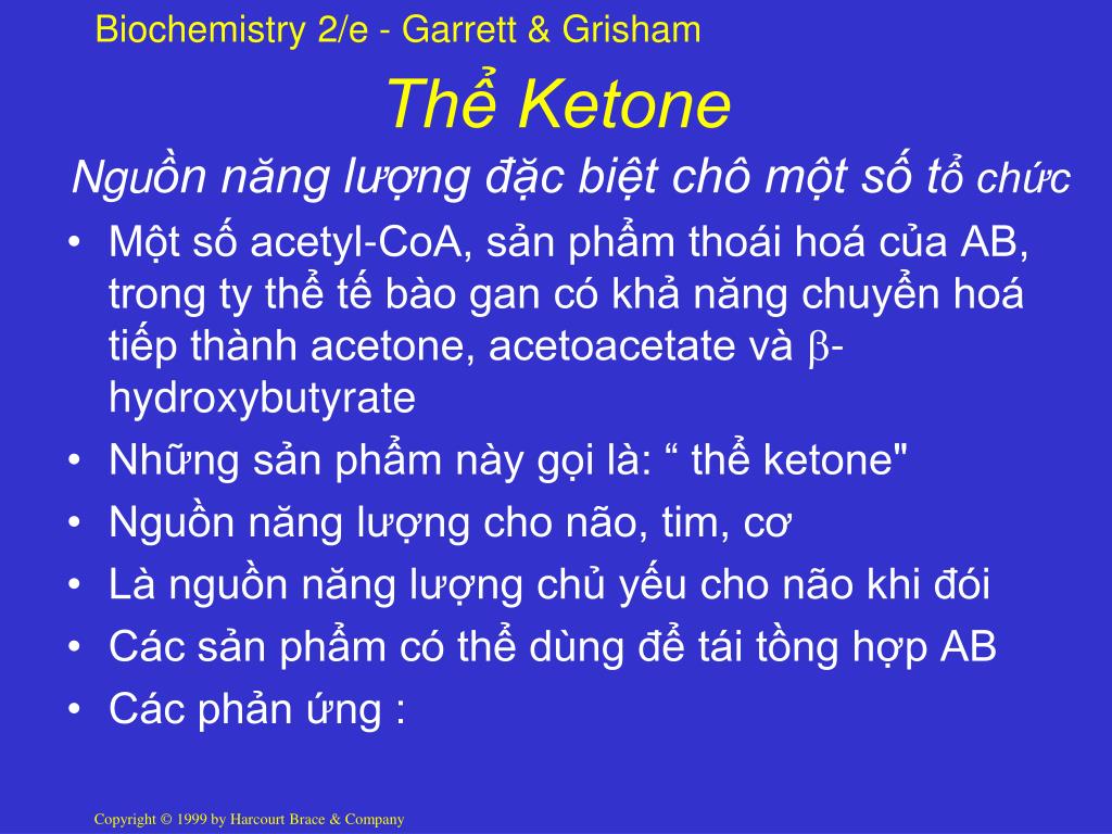Thể Ketone Nguồn năng lượng đặc biệt chô một số tổ chức • Một số acetyl-CoA, sản phẩm thoái hoá của AB, trong ty thể tế bào gan có khả năng chuyển hoá tiếp thành acetone, acetoacetate và -hydroxybutyrate • Những sản phẩm này gọi là: “ thể ketone" • Nguồn năng lượng cho não, tim, cơ • Là nguồn năng lượng chủ yếu cho não khi đói • Các sản phẩm có thể dùng để tái tồng hợp AB • Các phản ứng :