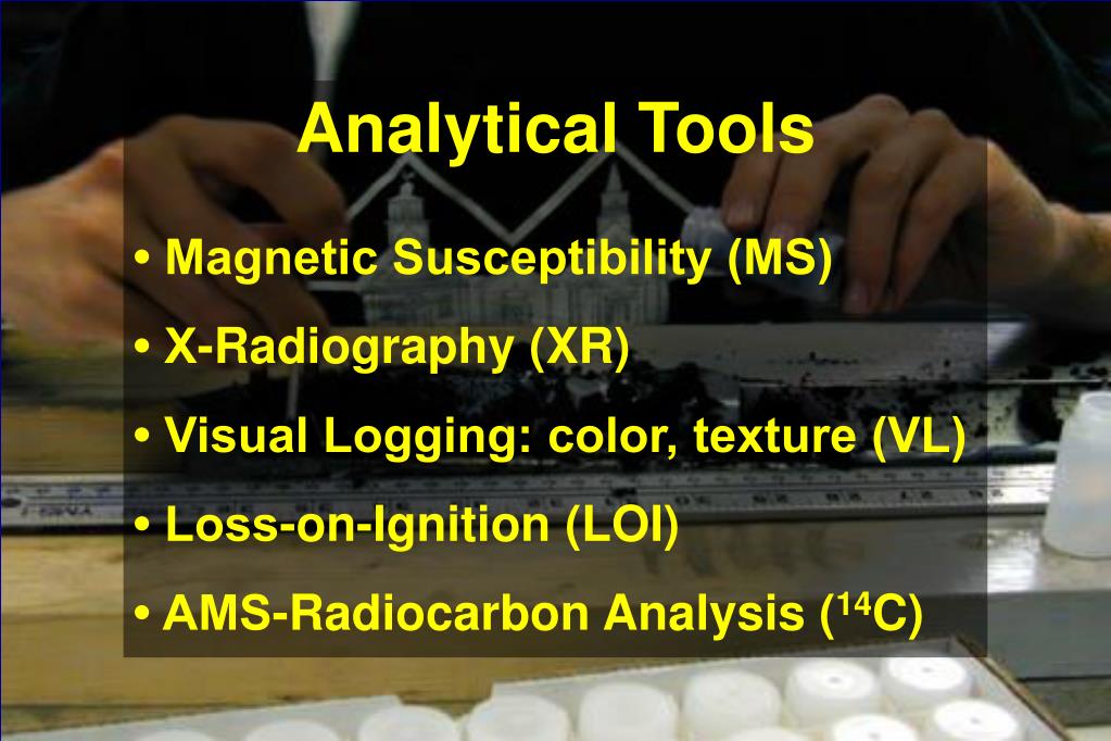 Analytical Tools • Magnetic Susceptibility (MS) • X-Radiography (XR) • Visual Logging: color, texture (VL) • Loss-on-Ignition (LOI) • AMS-Radiocarbon Analysis (14C)
