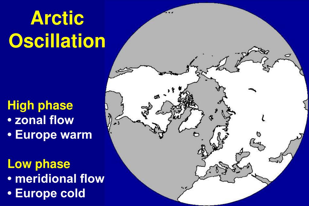 Arctic Oscillation High phase • zonal flow • Europe warm Low phase • meridional flow • Europe cold