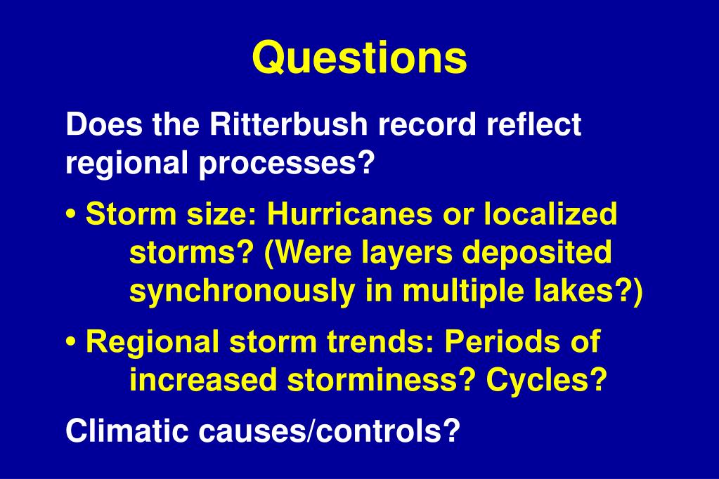 Questions Does the Ritterbush record reflect regional processes? • Storm size: Hurricanes or localized storms? (Were layers deposited synchronously in multiple lakes?) • Regional storm trends: Periods of increased storminess? Cycles? Climatic causes/controls?