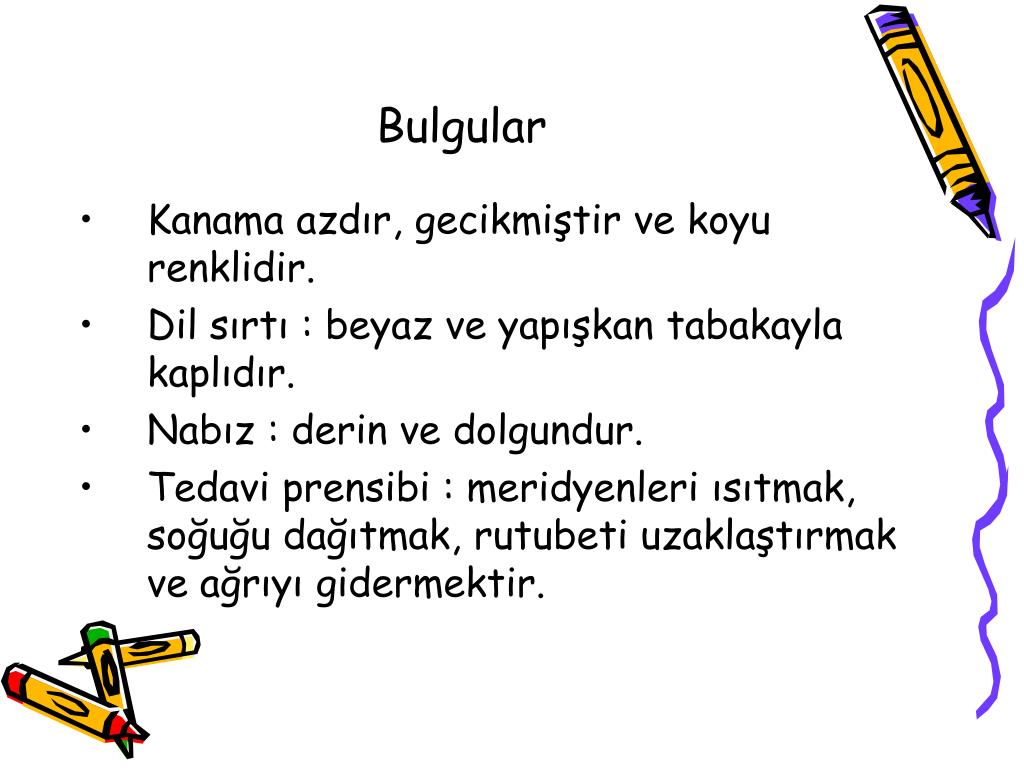 Bulgular • Kanama azdır, gecikmiştir ve koyu renklidir. • Dil sırtı : beyaz ve yapışkan tabakayla kaplıdır. • Nabız : derin ve dolgundur. • Tedavi prensibi : meridyenleri ısıtmak, soğuğu dağıtmak, rutubeti uzaklaştırmak ve ağrıyı gidermektir.