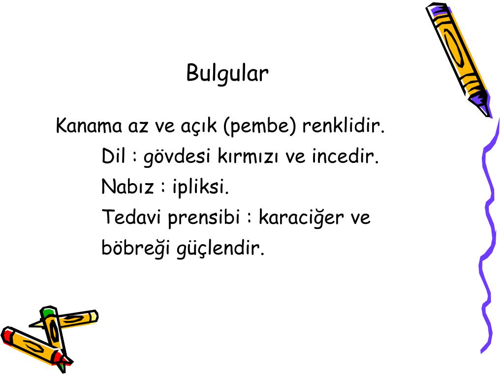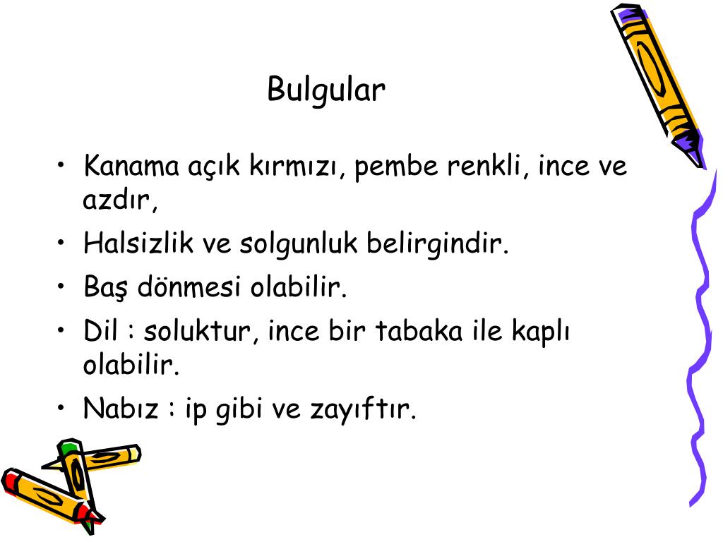 Bulgular • Kanama açık kırmızı, pembe renkli, ince ve azdır, • Halsizlik ve solgunluk belirgindir. • Baş dönmesi olabilir. • Dil : soluktur, ince bir tabaka ile kaplı olabilir. • Nabız : ip gibi ve zayıftır.
