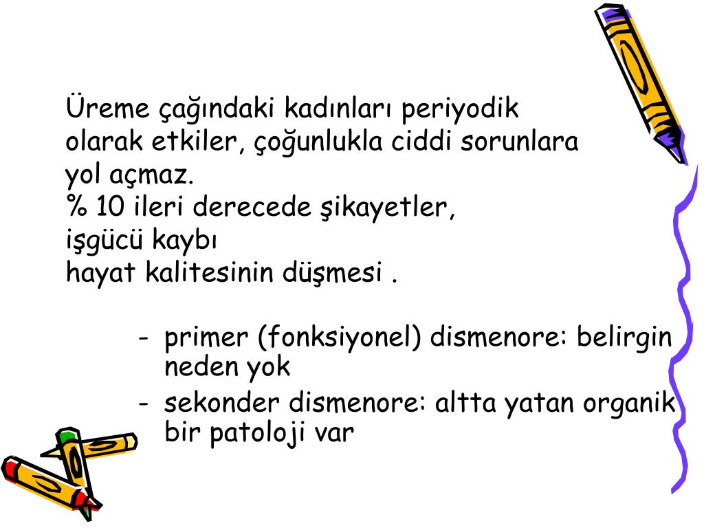 Üreme çağındaki kadınları periyodik olarak etkiler, çoğunlukla ciddi sorunlara yol açmaz. % 10 ileri derecede şikayetler, işgücü kaybıhayat kalitesinin düşmesi . • primer (fonksiyonel) dismenore: belirgin neden yok • sekonder dismenore: altta yatan organik bir patoloji var