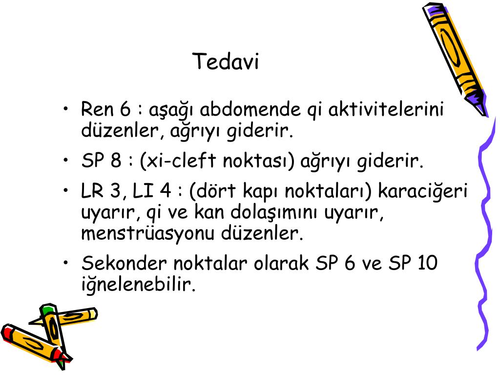 Tedavi • Ren 6 : aşağı abdomende qi aktivitelerini düzenler, ağrıyı giderir. • SP 8 : (xi-cleft noktası) ağrıyı giderir. • LR 3, LI 4 : (dört kapı noktaları) karaciğeri uyarır, qi ve kan dolaşımını uyarır, menstrüasyonu düzenler. • Sekonder noktalar olarak SP 6 ve SP 10 iğnelenebilir.