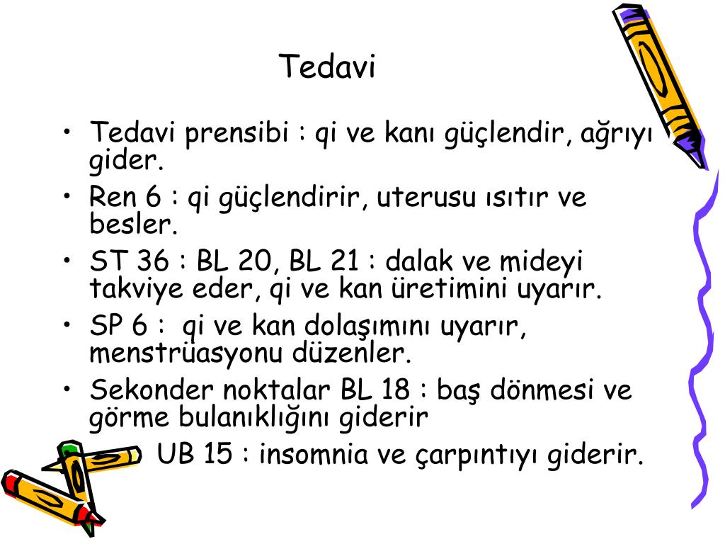 Tedavi • Tedavi prensibi : qi ve kanı güçlendir, ağrıyı gider. • Ren 6 : qi güçlendirir, uterusu ısıtır ve besler. • ST 36 : BL 20, BL 21 : dalak ve mideyi takviye eder, qi ve kan üretimini uyarır. • SP 6 : qi ve kan dolaşımını uyarır, menstrüasyonu düzenler. • Sekonder noktalar BL 18 : baş dönmesi ve görme bulanıklığını giderir • UB 15 : insomnia ve çarpıntıyı giderir.