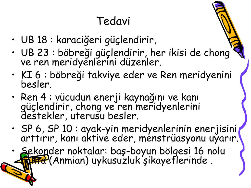 Tedavi • UB 18 : karaciğeri güçlendirir, • UB 23 : böbreği güçlendirir, her ikisi de chong ve ren meridyenlerini düzenler. • KI 6 : böbreği takviye eder ve Ren meridyenini besler. • Ren 4 : vücudun enerji kaynağını ve kanı güçlendirir, chong ve ren meridyenlerini destekler, uterusu besler. • SP 6, SP 10 : ayak-yin meridyenlerinin enerjisini arttırır, kanı aktive eder, menstrüasyonu uyarır. • Sekonder noktalar: baş-boyun bölgesi 16 nolu nokta (Anmian) uykusuzluk şikayetlerinde .