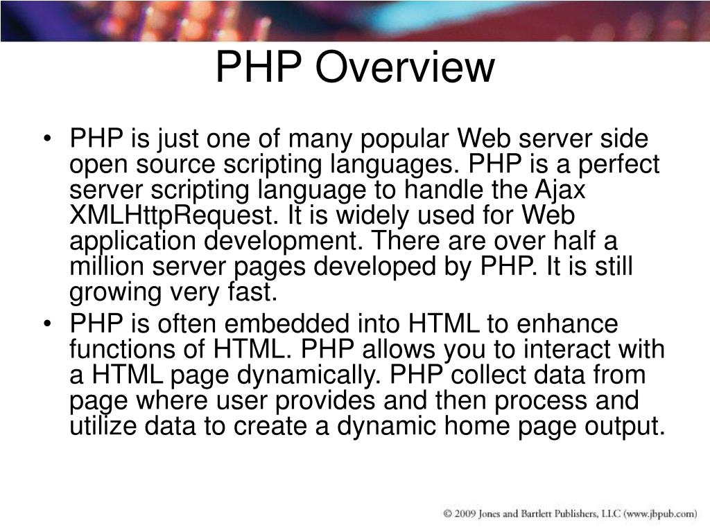 PHP Overview • PHP is just one of many popular Web server side open source scripting languages. PHP is a perfect server scripting language to handle the Ajax XMLHttpRequest. It is widely used for Web application development. There are over half a million server pages developed by PHP. It is still growing very fast. • PHP is often embedded into HTML to enhance functions of HTML. PHP allows you to interact with a HTML page dynamically. PHP collect data from page where user provides and then process and utilize data to create a dynamic home page output.