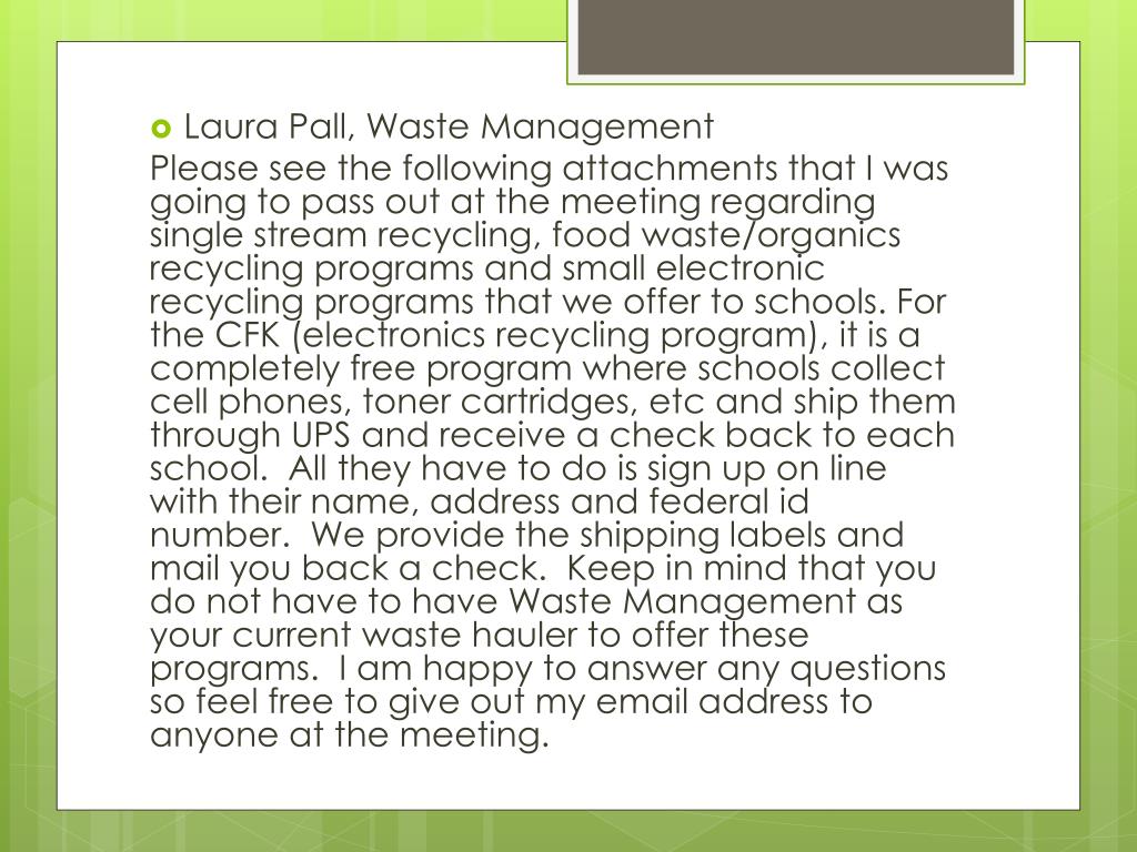 Laura Pall, Waste Management Please see the following attachments that I was going to pass out at the meeting regarding single stream recycling, food waste/organics recycling programs and small electronic recycling programs that we offer to schools. For the CFK (electronics recycling program), it is a completely free program where schools collect cell phones, toner cartridges, etc and ship them through UPS and receive a check back to each school. All they have to do is sign up on line with their name, address and federal id number. We provide the shipping labels and mail you back a check. Keep in mind that you do not have to have Waste Management as your current waste hauler to offer these programs. I am happy to answer any questions so feel free to give out my email address to anyone at the meeting.