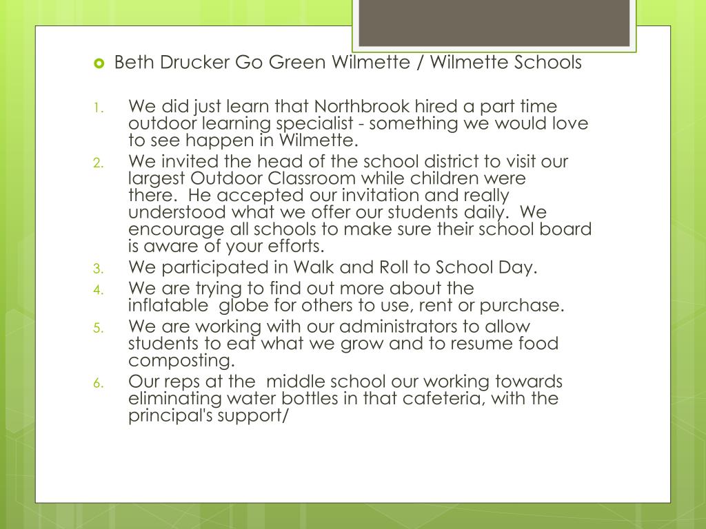 Beth Drucker Go Green Wilmette / Wilmette Schools • We did just learn that Northbrook hired a part time outdoor learning specialist - something we would love to see happen in Wilmette. • We invited the head of the school district to visit our largest Outdoor Classroom while children were there. He accepted our invitation and really understood what we offer our students daily. We encourage all schools to make sure their school board is aware of your efforts. • We participated in Walk and Roll to School Day. • We are trying to find out more about the inflatable globe for others to use, rent or purchase. • We are working with our administrators to allow students to eat what we grow and to resume food composting. • Our reps at the middle school our working towards eliminating water bottles in that cafeteria, with the principal's support/