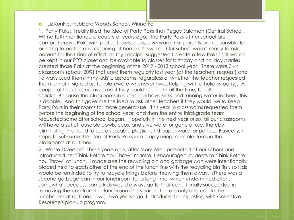 Liz Kunkle, Hubbard Woods School, Winnetka 1. Party Paks: I really liked the idea of Party Paks that Peggy Salamon (Central School, Wilmette?) mentioned a couple of years ago. The Party Paks at her school are comprehensive Paks with plates, bowls, cups, silverware that parents are responsible for bringing to parties and cleaning at home afterward. Our school wasn't ready to ask parents for that kind of effort, so my Principal suggested I create a few Paks that would be kept in our PTO closet and be available to classes for birthday and holiday parties. I created those Paks at the beginning of the 2012 - 2013 school year. There were 3 - 4 classrooms (about 20%) that used them regularly last year (at the teachers' request) and I always used them in my kids' classrooms, regardless of whether the teacher requested them or not (I signed up for plateware whenever I was helping with a holiday party). A couple of the classrooms asked if they could use them all the time, for all snacks. Because the classrooms in our school have sinks and running water in them, this is doable. And this gave me the idea to ask other teachers if they would like to keep Party Paks in their rooms for more general use. This year, 6 classrooms requested them before the beginning of the school year, and then the entire third-grade team requested some after school began. Hopefully in the next year or so, all our classrooms will have a set of reusable bowls, cups, and silverware for general use, thereby eliminating the need to use disposable plastic- and paper-ware for parties. Basically, I hope to subsume the idea of Party Paks into simply using reusable items in the classrooms at all times. 2. Waste Diversion: Three years ago, after Mary Allen presented at our school and introduced her "Think Before You Throw" mantra, I encouraged students to "Think Before You Throw" at lunch. I made sure the recycling bin and garbage can were intentionally placed next to each other at the end of the lunch line with the recycling bin first, so kids would be reminded to try to recycle things before throwing them away. (There was a second garbage can in our lunchroom for a long time, which undermined efforts somewhat, because some kids would always go to that can. I finally succeeded in removing the can from the lunchroom this year, so there is only one can in the lunchroom at all times now.) Two years ago, I introduced composting with Collective Resource's pick-up program.