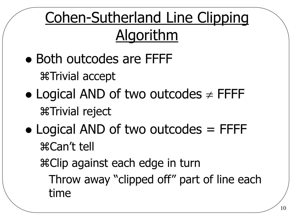 Cohen-Sutherland Line Clipping Algorithm • Both outcodes are FFFF • Trivial accept • Logical AND of two outcodes FFFF • Trivial reject • Logical AND of two outcodes = FFFF • Can’t tell • Clip against each edge in turn Throw away “clipped off” part of line each time