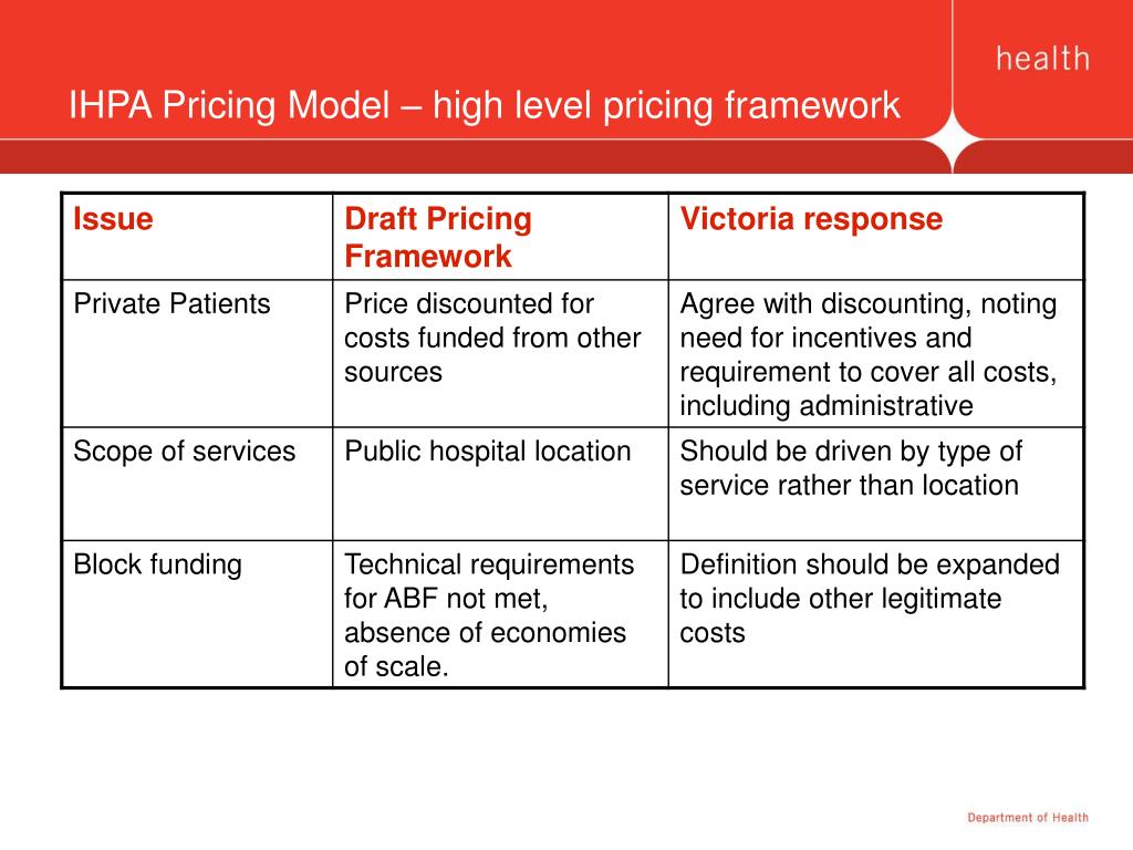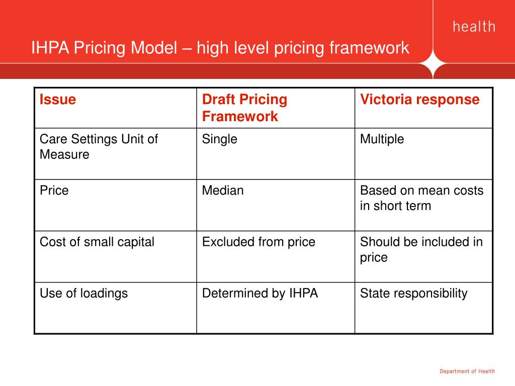 IHPA Pricing Model Next steps for the pricing model The March 30th deliverables from IHPA to governments are expected to include: the draft NEP determination; the Pricing Model with details of the cost and volume specifications used (this will be an Appendix to the Determination); and the draft Pricing Framework. 45 Days for governments to review.