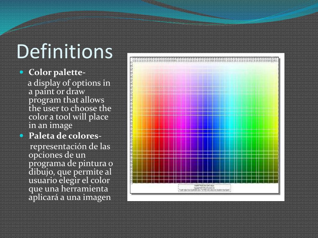 Definitions • Color palette- a display of options in a paint or draw program that allows the user to choose the color a tool will place in an image • Paleta de colores- representación de las opciones de un programa de pintura o dibujo, que permite al usuario elegir el color que una herramienta aplicará a una imagen