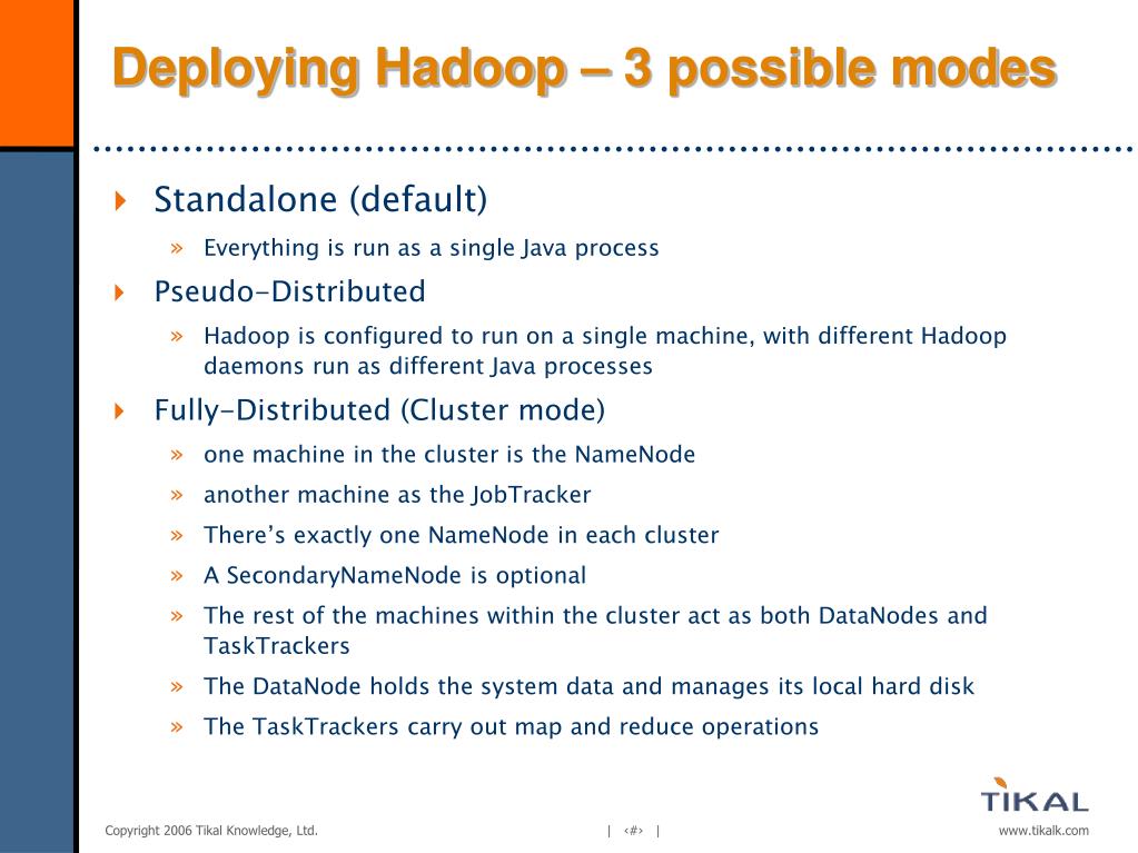 Deploying Hadoop – 3 possible modes Standalone (default) Everything is run as a single Java process Pseudo-Distributed Hadoop is configured to run on a single machine, with different Hadoop daemons run as different Java processes Fully-Distributed (Cluster mode) one machine in the cluster is the NameNode another machine as the JobTracker There’s exactly one NameNode in each cluster A SecondaryNameNode is optional The rest of the machines within the cluster act as both DataNodes and TaskTrackers The DataNode holds the system data and manages its local hard disk The TaskTrackers carry out map and reduce operations